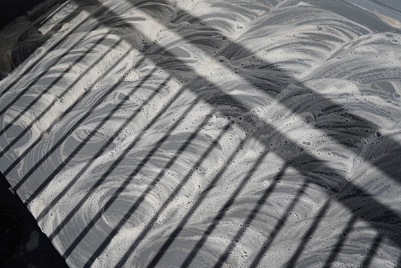 散水用ノズルで水を調節しながら、洗剤と汚れを落とします。