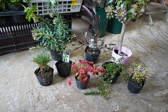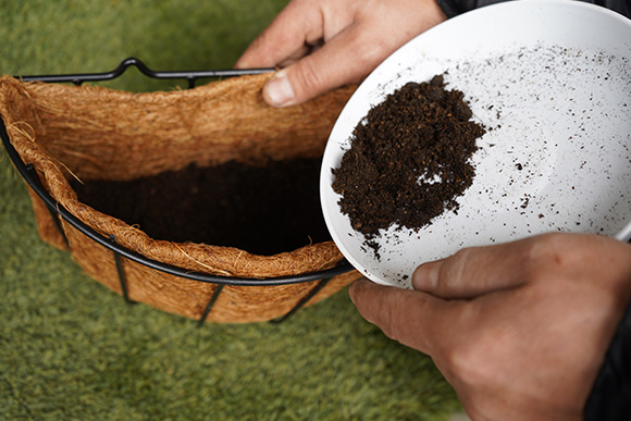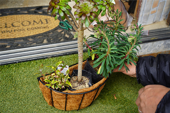 寄せ植えにする植物の苗を、バスケットに配置します。
