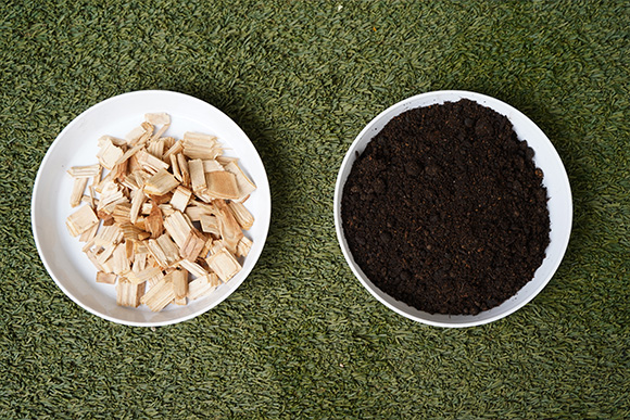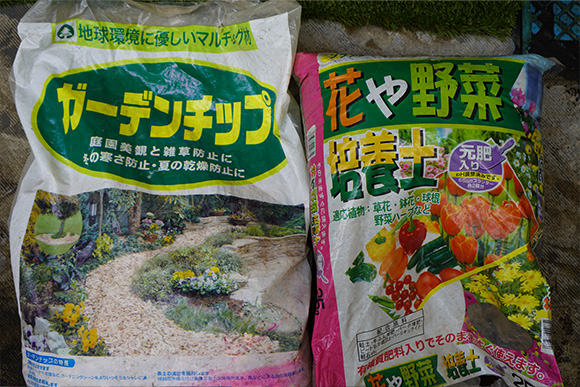 「ガーデンチップ」と「花や野菜の培養土」を使います。