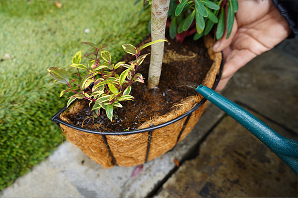 土を足して内部の空気を抜き、しっかりと培養土をならし、水をたっぷりと注ぎます。