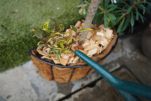 三家さんハンギングバスケットは土が少ないので、土を安定させるためにガーデンチップを敷き詰めます。土埃が出ませんし、夏の直射日光を避けるのにも役立ちます。表面が土そのままよりも、ビジュアル的に美しく見えるという効果もあります。