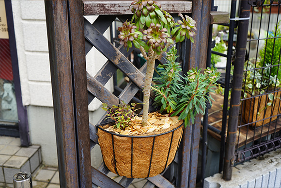三家さんハンギングバスケットは、見た目もきれいですし、常緑の観葉植物を寄せ植えすれば一年中グリーンが楽しめます。ご家族や子ども向けのワークショップでも、「あまり難しいことを考えず、自分のセンスで常識にとらわれないで好きな植物の寄せ植えを試してみてください」とお話しています。