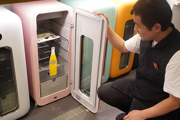 前田さん従来のワインセラーというとクラシックなデザインが主流でしたが、ワインセラーmuniは、遊び心満載のポップで軽やかなデザインです。リビング・ダイニングにそのまま置いてもインテリアにフィットする、新しいタイプのワインセラーですね。ワインセラーの老舗メーカーが作っていて、もっと若い人にもカジュアルにワインセラーを暮らしに取り入れて、ワインを楽しんでほしいという思いが込められています。もちろんワインだけでなく、日本酒やクラフトビール、ソフトドリンクを保管するセカンド冷蔵庫的な使い方もできます。