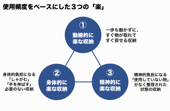 使用頻度をベースに、動線・身体・精神的に「楽」な3つの収納方法を基本に考えます。