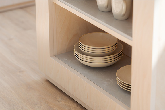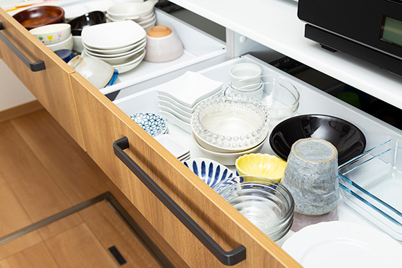 腰の高さの引き出しに、ふだんよく使う食器類を入れておくと、