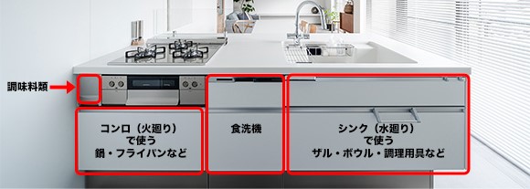 吊り戸棚あり/なしそれぞれのメリット/デメリットを知った上で、3つの「楽」や収納前の事前準備を行えばよいと思います。基本は、使用頻度と歩数ゼロ収納です。
