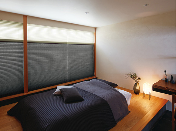 ニチベイのプリーツスクリーン「もなみグランツ」のツインスタイルは、上下のどちらかに透け感のあるシースルー生地を配して、外の景色や光を取り込むことができます。こちらもコード穴が見えずすっきりしたデザインとなります。遮熱効果のある生地が充実しているので、眺望性や調光性に優れた生地を選んで、ツインスタイルにするといいですね。和のスタイルにも洋のスタイルにも溶け込みます。