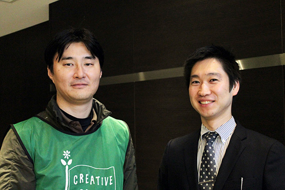 イベントの企画運営を担当している東邦レオ株式会社の吉田啓助さん(写真左)と、マンションを管理する三菱地所コミュニティ株式会社の髙田雄太さん(写真右)。お二人とも、管理組合と協力して住み心地のよいマンションづくりを目指しています。