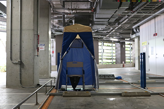 マンホールトイレ(汚水槽に直結)を地下駐車場に設営したところ。公共の下水管が使用できなくなっても大丈夫なように、地下に5000トン分(25mプール約10.4杯分!)の汚水タンクを完備しています。