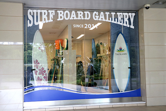 マンションのエントランス近くにあるサーフボードギャラリー。