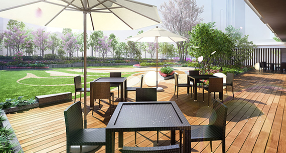 敷地内のサクラ・ガーデンを見晴らすココチ・テラスでは