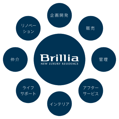 Brilliaは、洗練と安心を理念に、みなさまの暮らしに寄り添う、住まいの“トータルブランド”です。建物の提供だけでなく、東京建物グループのさまざまなサービスを通して、みなさまの価値あるライフスタイルの実現をお手伝いいたします。マンションの企画・開発・販売・管理・仲介・リノベーション・インテリアなど、当社グループが提供するサービスにかかわるすべての方々に、洗練と安心の住まいをBrilliaは共に考え、共につくっていきます。