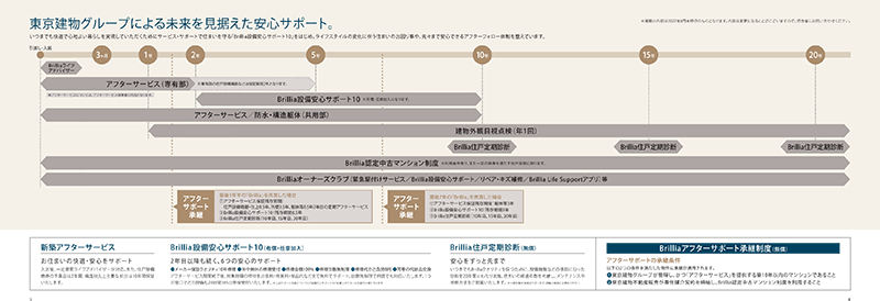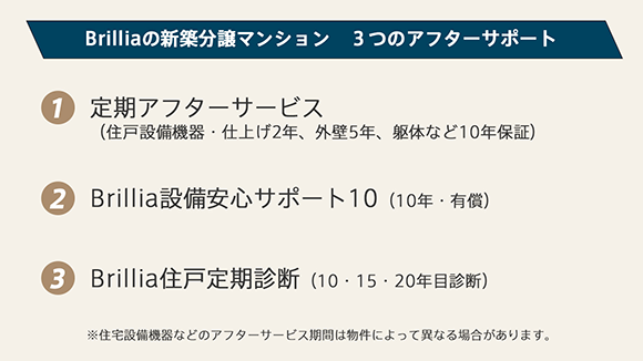 東京建物 武田さん東京建物グループでは、Brilliaの新築分譲マンションを購入いただいたお客様に、3つのアフターサポートを長期にわたってご提供しております。Brilliaオーナーであるお客様の暮らしをずっと見守り続け、安心をお届けすることが東京建物グループのミッションでもあります。