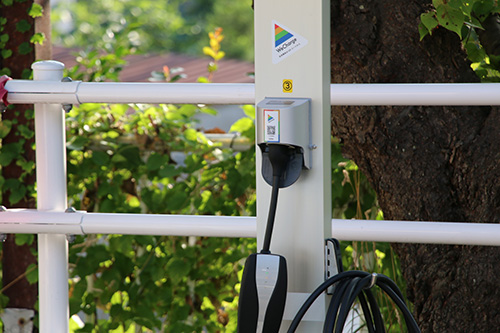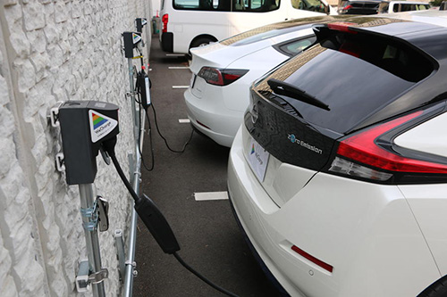 充電コンセント付き駐車場で充電中のEV。