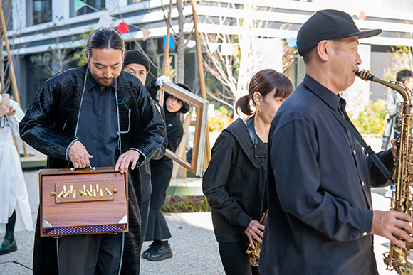 ガーデンを練り歩く、パフォーマーとミュージシャンによるパフォーマンスアート。