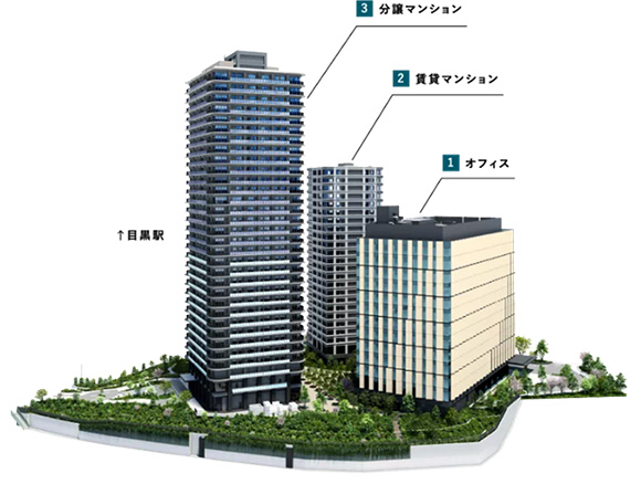 オフィス・賃貸マンション・分譲マンションの3棟からなる複合開発