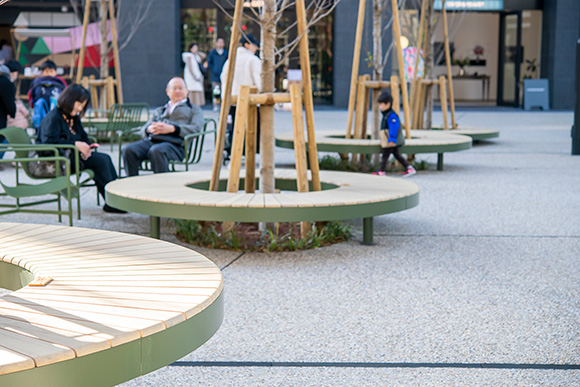 ベンチには、国産材および多摩産材のヒノキ材が使用されています。