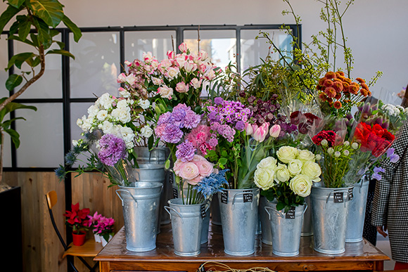 お店でお花を受け取って持ち帰れるのは、職住近接の複合施設ならではのサービス。