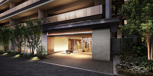 ※掲載のエントランス・エントランスラウンジ完成予想CGは計画段階の図面を基に描いたもので実際とは異なります。また、今後変更になる場合があります。設備機器・配管類等は一部省略または簡略化しております。タイルや各種部材につきましては、実物と質感・色等の見え方が異なる場合があります。植栽は特定の季節の状況を表現したものではなく、竣工時には完成予想CG程度には成長しておりません。ボリューム・形状は実際と異なる場合があり、樹種等は変更となる場合があります。
