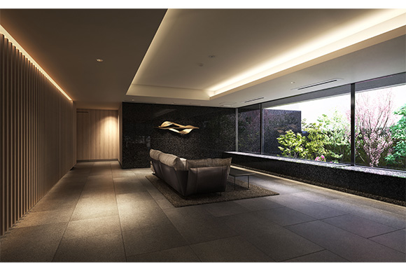 ※掲載の各完成予想CGは、計画段階の図面を基に描き起こしたもので、実際とは異なります。植栽は、特定の季節やご入居時の状態を想定して描かれたものではありません。周辺道路・建物等は簡略化しております。雨樋、エアコン室外機、給湯器、TVアンテナ等再現されていない設備機器等がございます。共用部の家具・照明器具・調度品等は、実際に設置されるものと異なる場合があります。また、エントランスホールの壁にあるアート作品は制作中となり、デザインや素材をもとに完成イメージを表現したもので実物ではございません。
