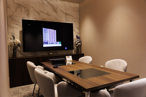新築マンションのデジタル模型を投影した空中ディスプレイのある商談室。