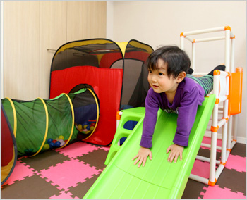 遊び部屋には滑り台も完備。いろいろな滑り方や遊び方を常に模索中!?