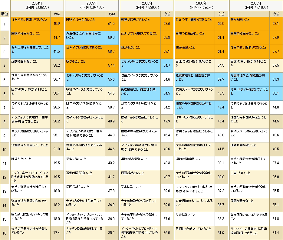 また、「セキュリティ」や「耐震性の高さ」なども、5年間を通して上位にランクインしており、安心・安全に対するこだわりも強いことが分かる。