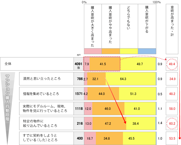 その「購入意欲が高まった」と回答した方の割合は、マンション購入行動段階が進んでいる方ほど、より高い傾向が見られ、【特定の物件に絞り込んでいる】と回答した方の割合は60%に達しています。