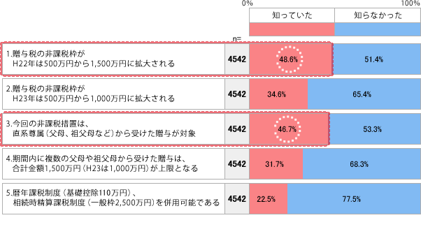 「住宅取得資金向けの贈与税の非課税枠の拡大」における項目について尋ねたところ、「1.贈与税の非課税枠がH22年は500万円から1,500万円に拡大される」、および、「3.今回の非課税措置は、直系尊属(父母、祖父母など)から受けた贈与が対象」の2項目について、各々約半数の方が「知っている」と回答しました。