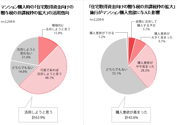また、「贈与税の非課税枠がH22年は500万円から1,500万円に拡大される」ことを知っていたと回答した48.6%の方に対し、マンション購入時に「住宅取得資金向けの贈与税の非課税枠の拡大」を活用するかどうかを尋ねたところ「活用しようと思う」と回答した方が約64%、マンション購入意欲が高まったかどうかを尋ねたところ「購入意欲が高まった」と回答した方が約44%にのぼっており、肯定的な回答が多く見られる結果となりました。