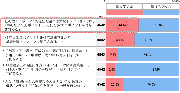 「住宅版エコポイント制度」における項目について尋ねたところ、「1.住宅版エコポイント対象住宅基準を満たすマンションでは、1戸あたり30万ポイント(30万円分)のエコポイントが付与されること」、および、「2.住宅版エコポイント対象住宅基準を満たす新築分譲マンションに適用されること」について、4割前後の方が「知っている」と回答しました。