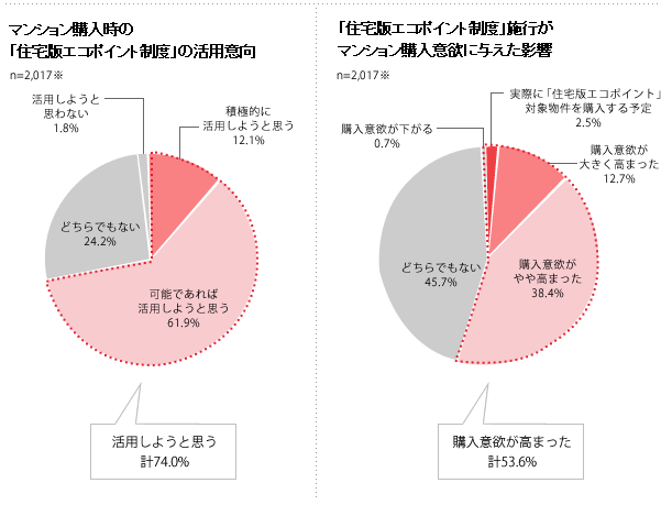 また、「住宅版エコポイント対象住宅基準を満たすマンションでは、1戸あたり30万ポイント(30万円分)のエコポイントが付与されること」を知っていたと回答した44.4%の方に対し、マンション購入時に「住宅版エコポイント制度」を活用するかどうかを尋ねたところ「活用しようと思う」と回答した方が74%、マンション購入意欲が高まったかどうかを尋ねたところ「購入意欲が高まった」と回答した方が約54%にのぼっており、前述した「住宅取得資金向けの贈与税の非課税枠の拡大」よりさらに肯定的な回答が多く見られる結果となりました。
