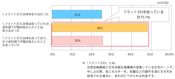 「フラット35S」自体、および「フラット35S」の金利引下げ幅が2010年2月15日から「-1.0%」に拡大されたことについての認知を尋ねたところ、「フラット35S」自体を知っていたと回答した方は約75%、金利引下げ幅が2010年2月15日から「-1.0%」に拡大されたことを知っていたと回答した方は約27%となりました。