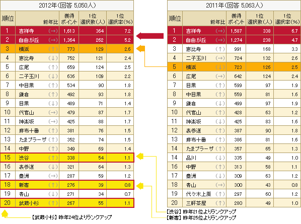 昨年に比べ「渋谷」「新宿」「武蔵小杉」などがランクアップ