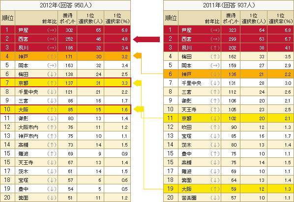 関西圏の上位トップ3は、全て兵庫県下の街がランクインする結果となりました。「芦屋」は2005年の調査開始以来8年連続で首位、「西宮」は4年連続で2位、「夙川」は2年連続で3位となっています。