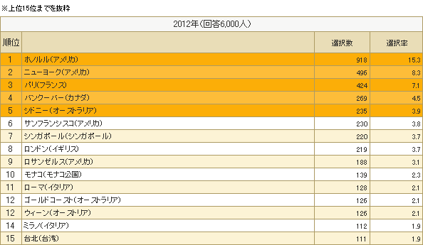 以下、「ニューヨーク」「パリ」「バンクーバー」「シドニー」が続く