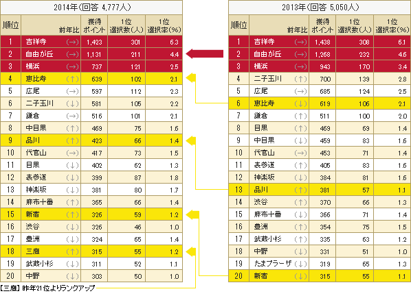 昨年に比べ「品川」「新宿」「三鷹」などが順位を上げる