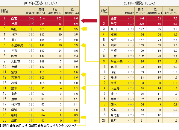 また、昨年に比べると「千里中央」が9位⇒6位、「宝塚」が13位⇒11位、「天王寺」が14位⇒12位、「茨木」が17位⇒14位、「谷町」が90位⇒19位、「箕面」が22位⇒20位と各々順位をあげる結果となりました。