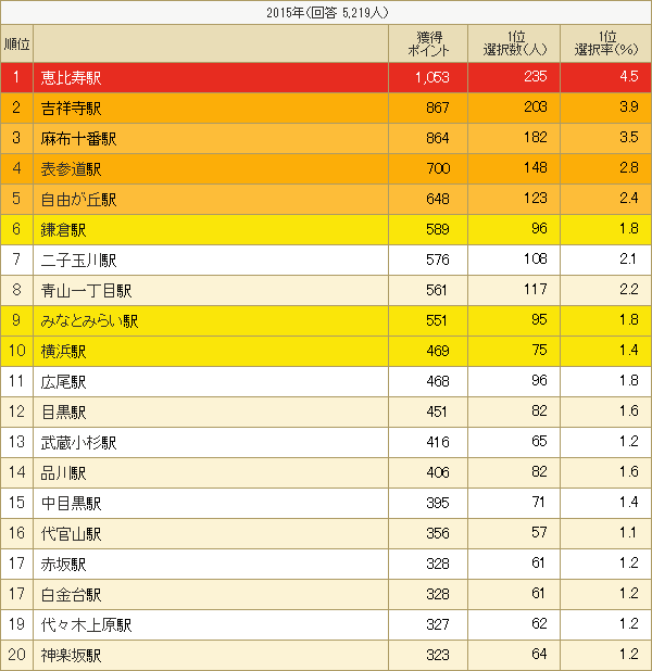 以下、2位は昨年トップの「吉祥寺駅」、3位は「麻布十番駅」、4位は「表参道駅」、5位は「自由が丘駅」が続いています。