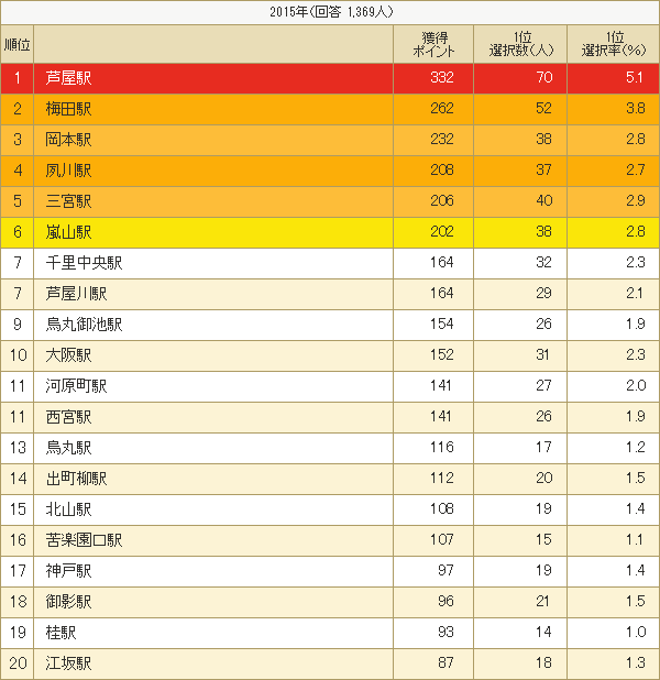 以下、2位「梅田駅」、3位「岡本駅」、4位「夙川駅」、5位「三宮駅」、6位「嵐山駅」の順となり、各々獲得ポイント200点台で続いています。