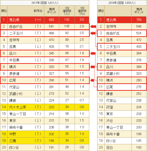 以下、2位は昨年3位の「自由が丘」、3位は昨年5位の「二子玉川」が続いています。