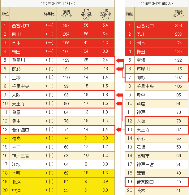 その他では、「苦楽園口」が19位→13位、「福島」「本町」「北浜」「中津」が昨年圏外から今年はランクインを果たしました。