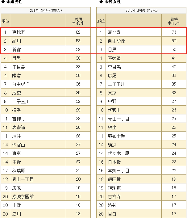 以下、男性は利便性の高い「品川」「新宿」、女性はおしゃれな「自由が丘」「目黒」が続く。