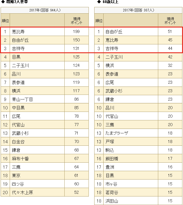 60歳以上のランキングは「自由が丘」が「恵比寿」を上回りトップに挙げられ、2位は「恵比寿」、3位は「吉祥寺」となりました。その他では「武蔵小杉」「鎌倉」が6位、「三鷹」が10位、「戸塚」が13位など、都心以外の街のランクインも目立ちました。