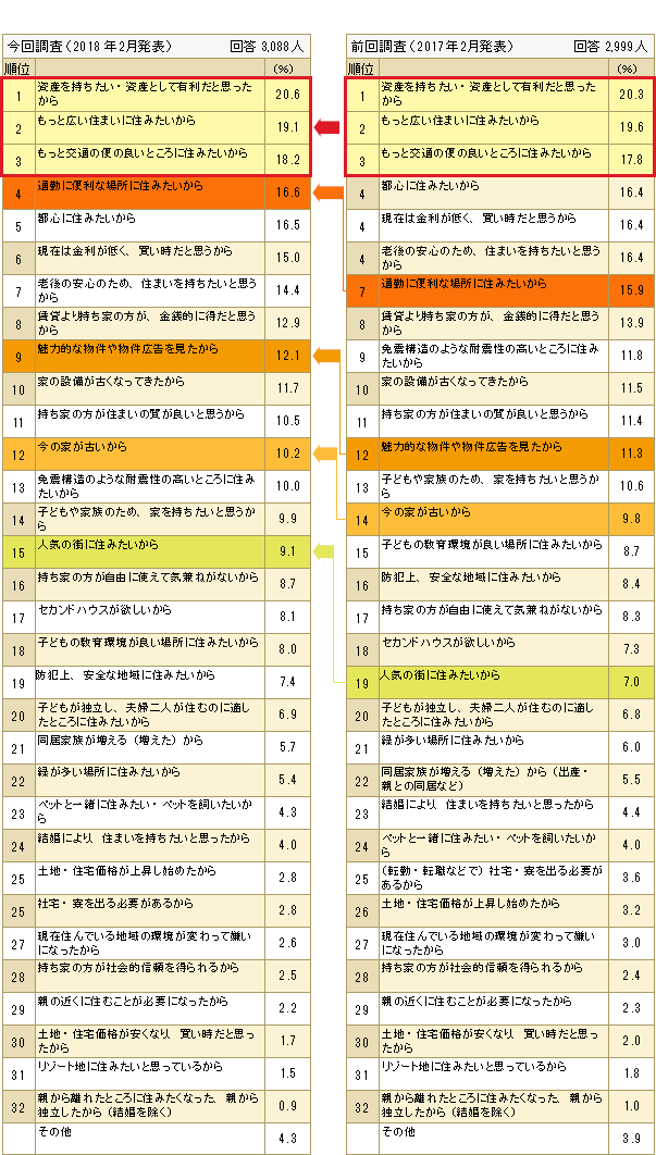 その他の項目をみると、「通勤に便利な場所に住みたいから」(7位→4位)、「魅力的な物件や物件広告を見たから」(12位→9位)、「今の家が古いから」(14位→12位)、「人気の街に住みたいから」(19位→15位)などの理由が前回調査より順位を上げています。