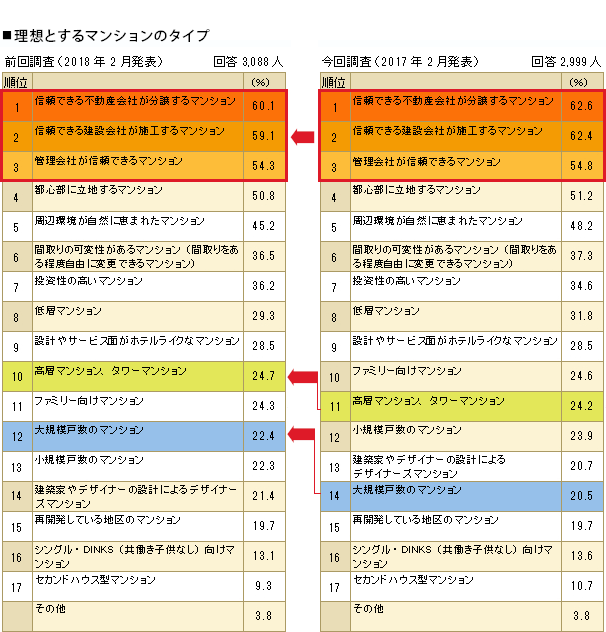 理想とするマンションのタイプは、前回に引き続き、「信頼できる不動産会社が分譲」「信頼できる建設会社が施工」「管理会社が信頼できる」がトップ3。