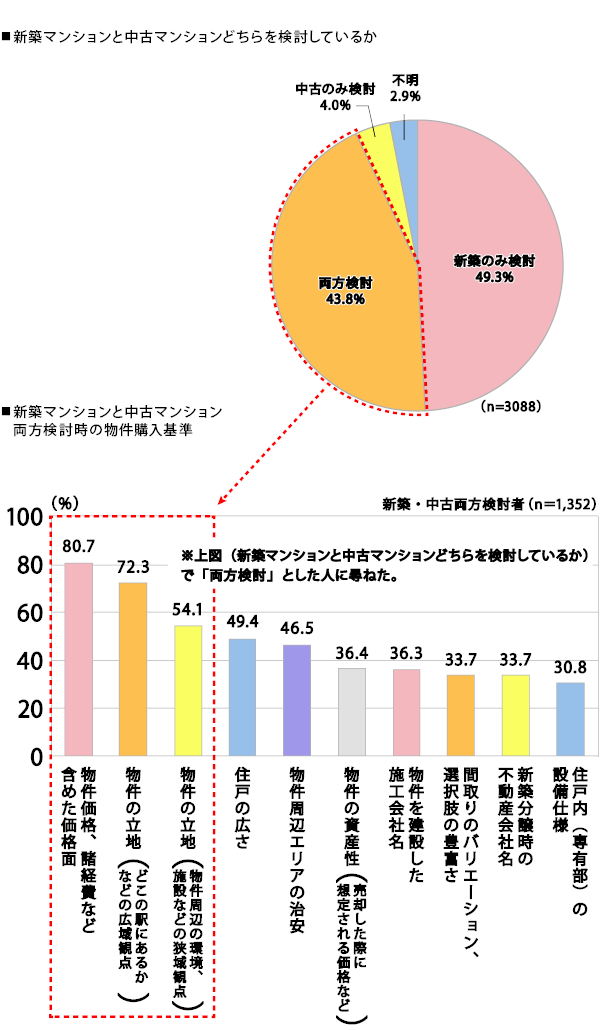 新築マンションと中古マンションを両方検討している人の物件購入基準は、「物件価格、諸経費など含めた価格面」「物件の立地(どこの駅にあるかなどの広域観点)」が上位。