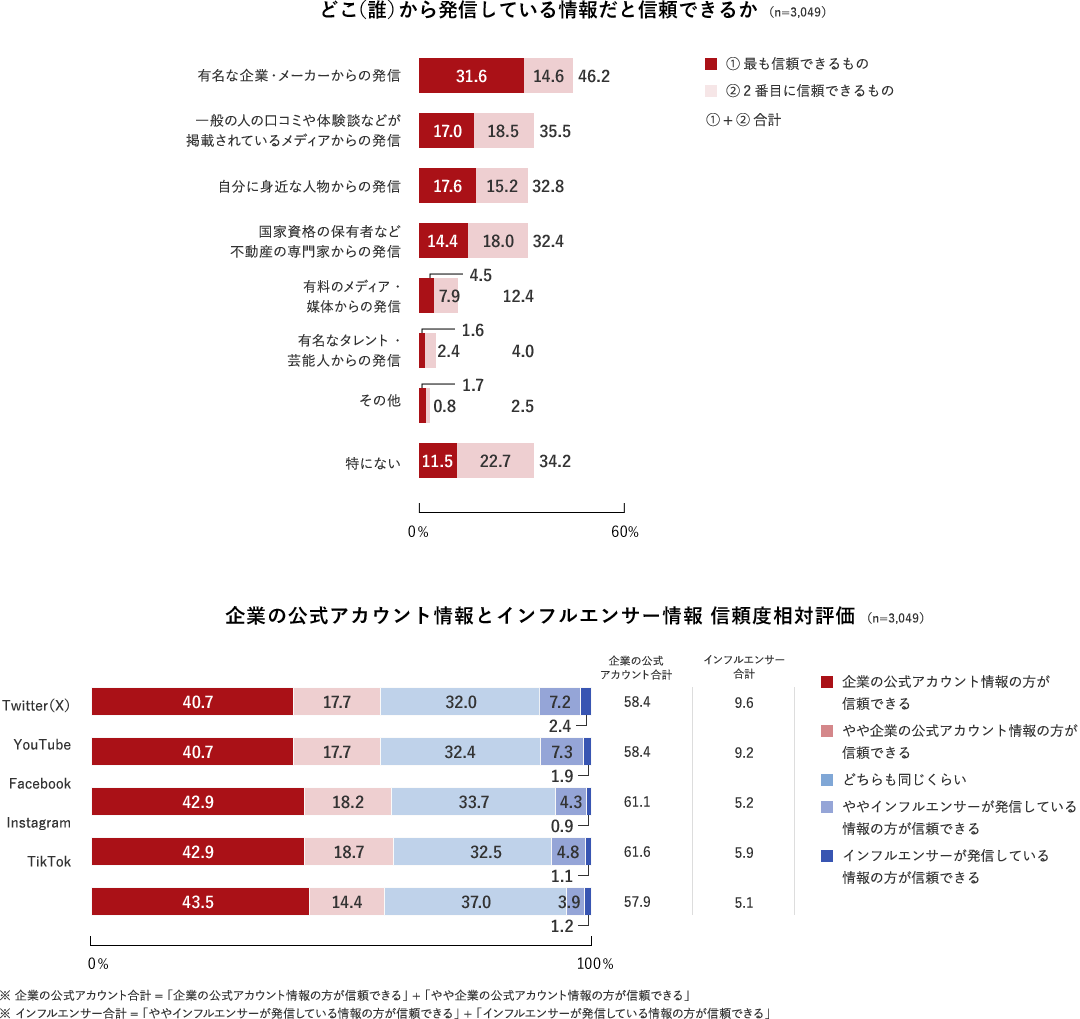 また、SNSから発信される企業の公式アカウントの情報とインフルエンサーの情報のどちらが信頼できるかを尋ねたところ、いずれのSNSにおいても「企業の公式アカウント」が「インフルエンサー」を大きく上回る結果となっています。