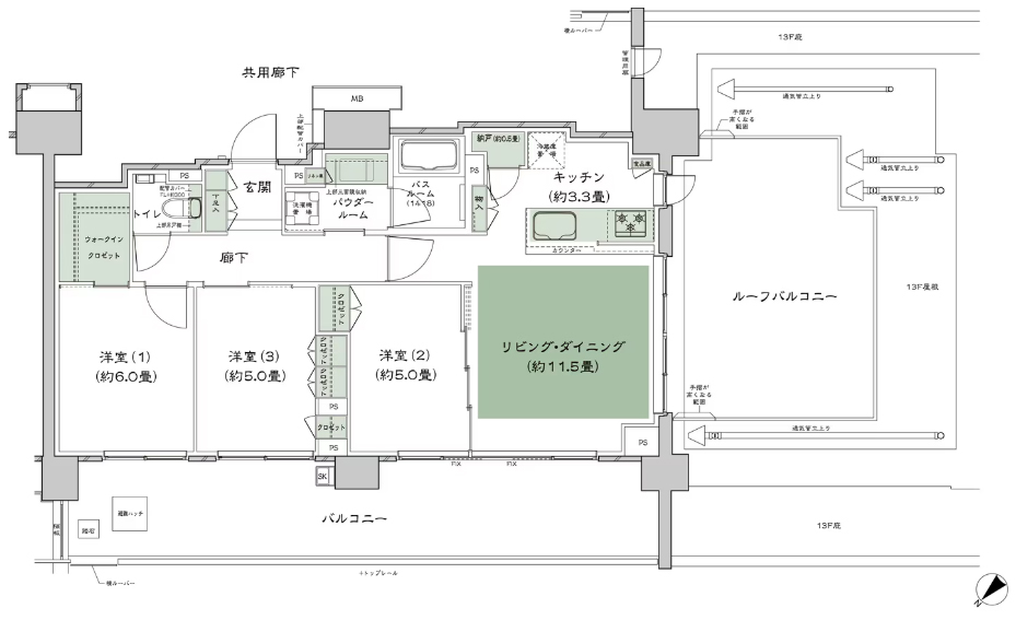 | その他面積 | バルコニー面積/12.00㎡ (3~12階)、11.00㎡ (13階) |