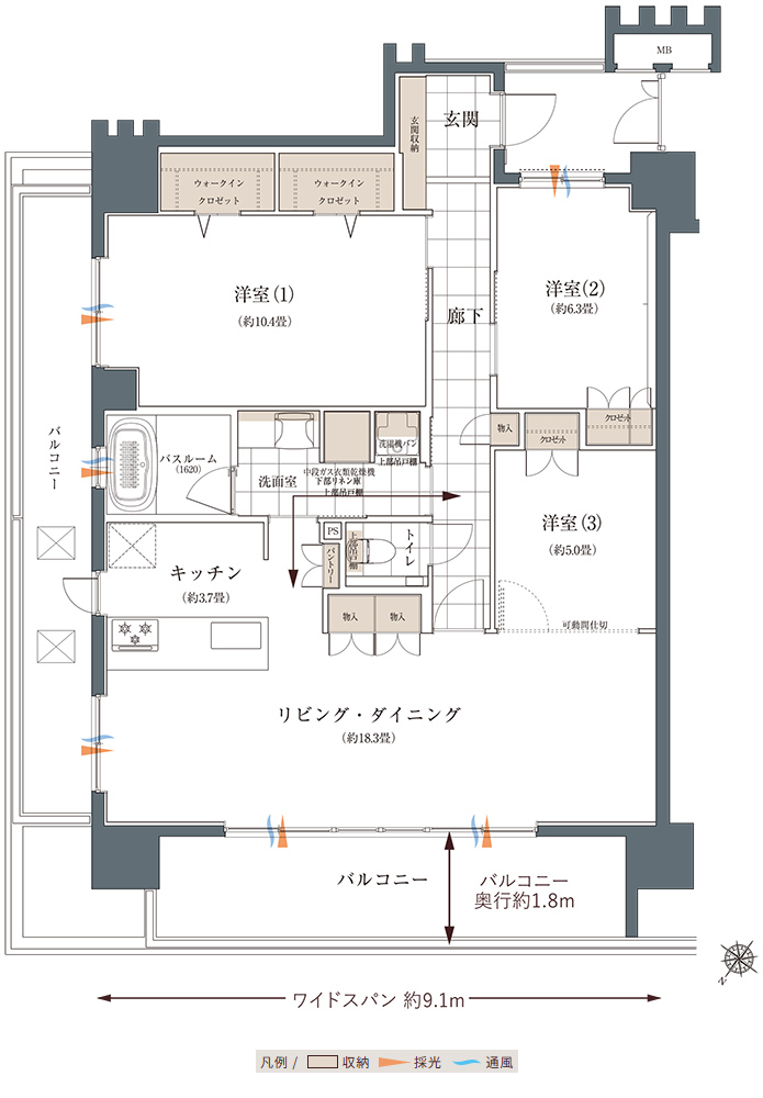 | 備考 | ■リビング・ダイニングに家族共用アイテムの収納に便利な物入を設置。 ■洋室(1)には大容量のウォークインクロゼットをご用意。 ■ 洋室(3)の可動間仕切壁を開放すれば約18.2畳の大空間に。 ■キッチンにはバルコニーに出られ、換気もできるドアを設置。 |